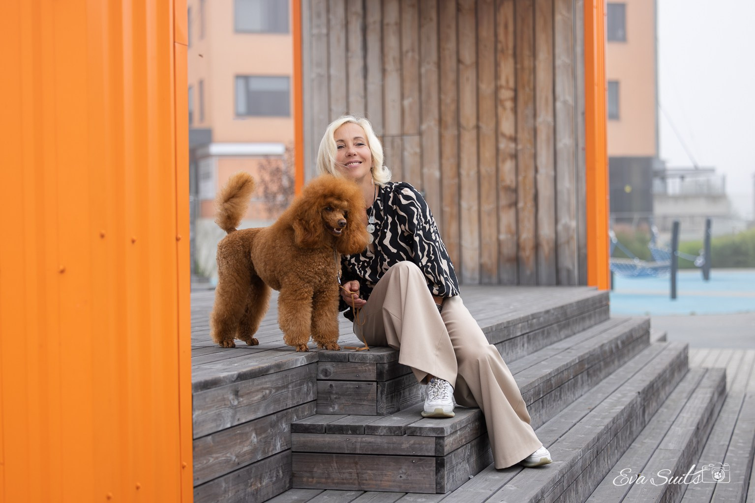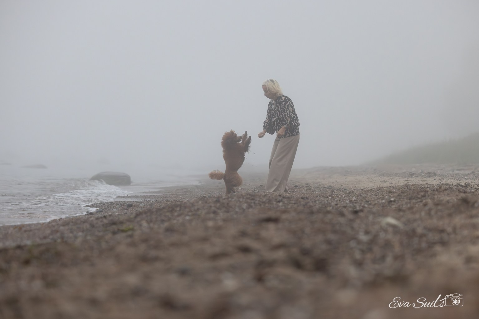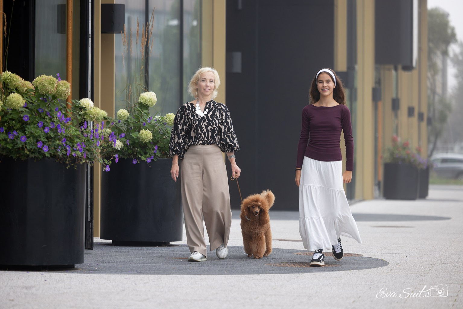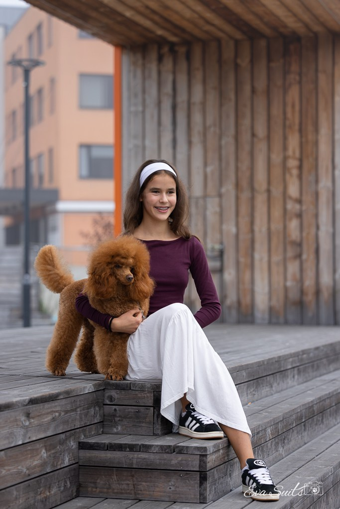 City shoot of a beautiful poodle girl and her family, wrapped in the soft colours of unexpected fog.