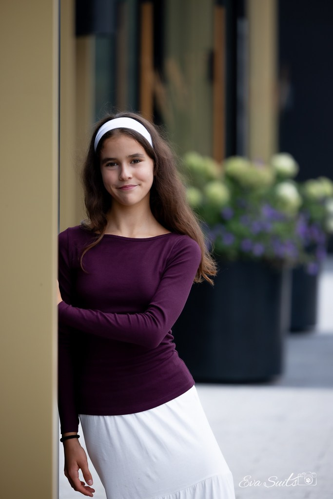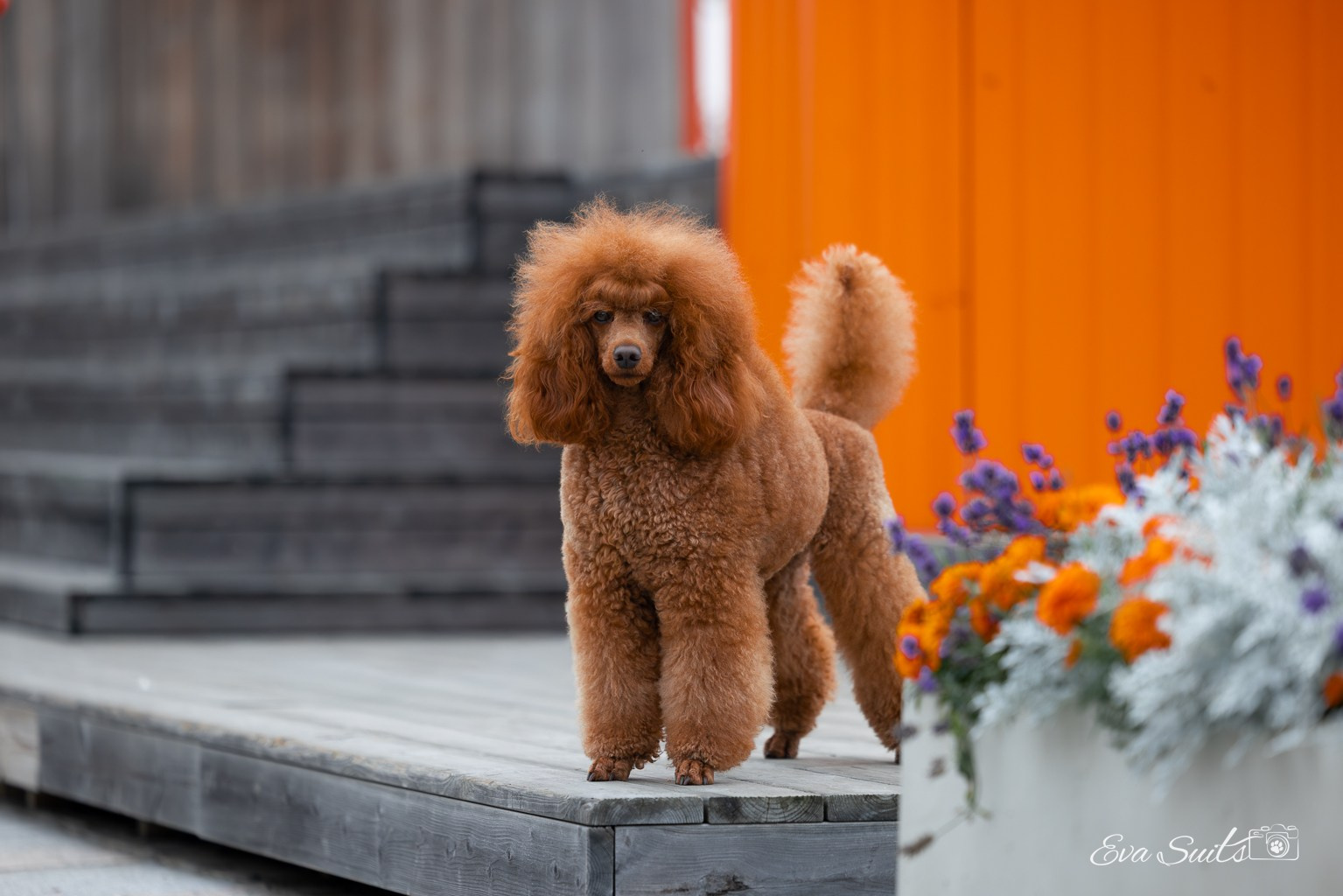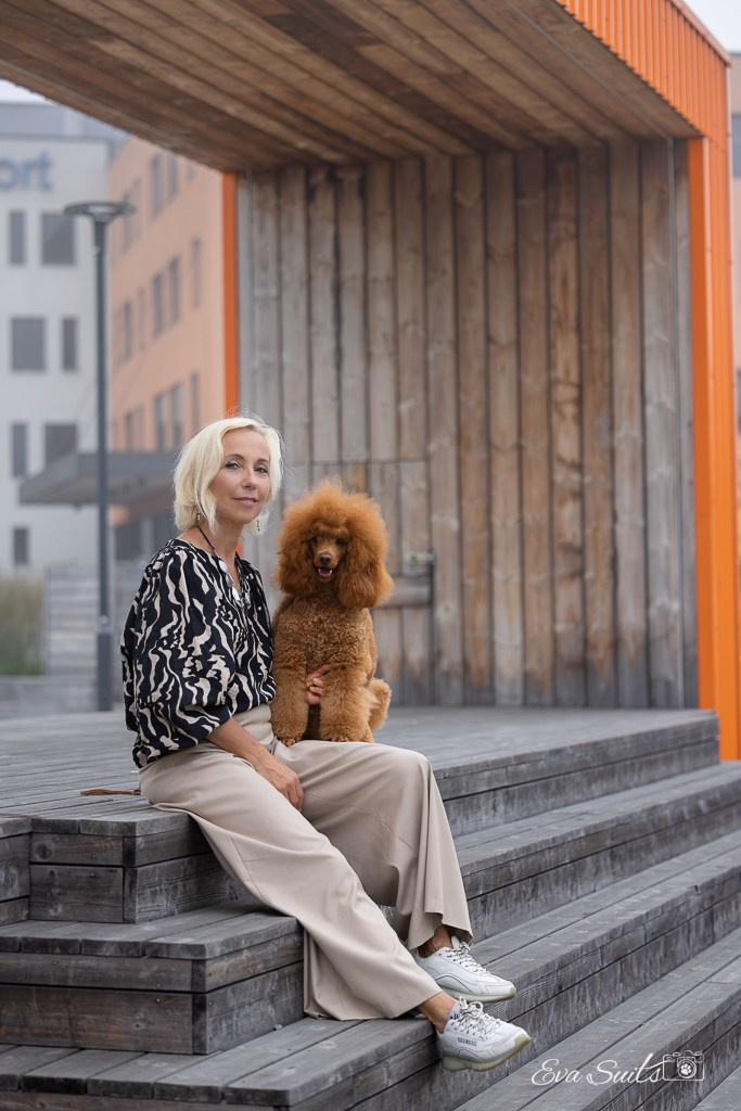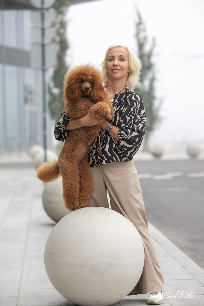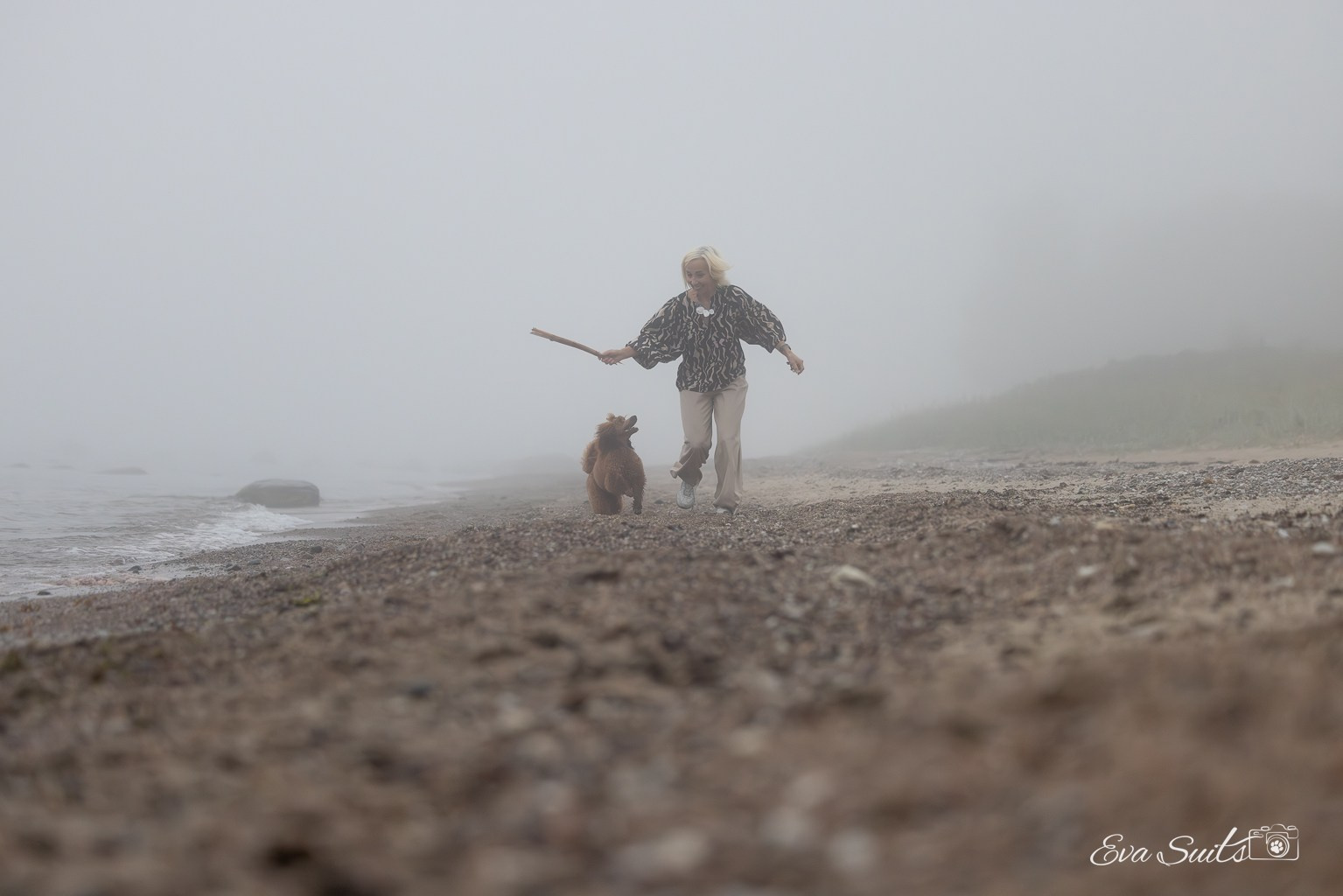 City shoot of a beautiful poodle girl and her family, wrapped in the soft colours of unexpected fog.